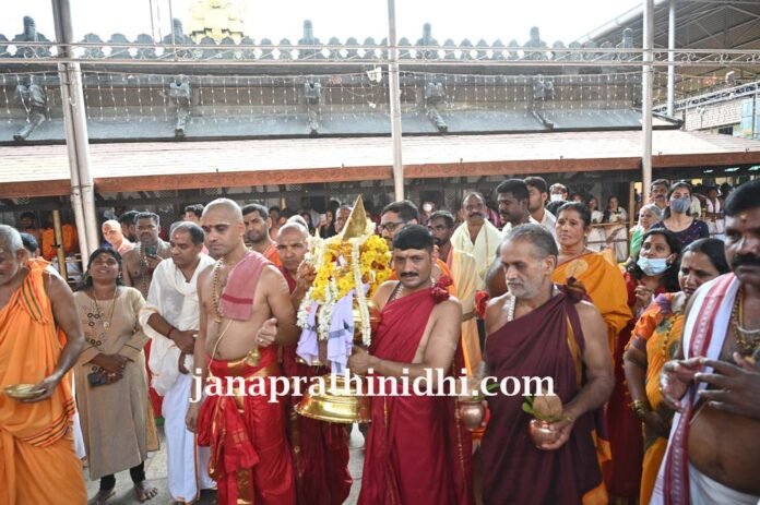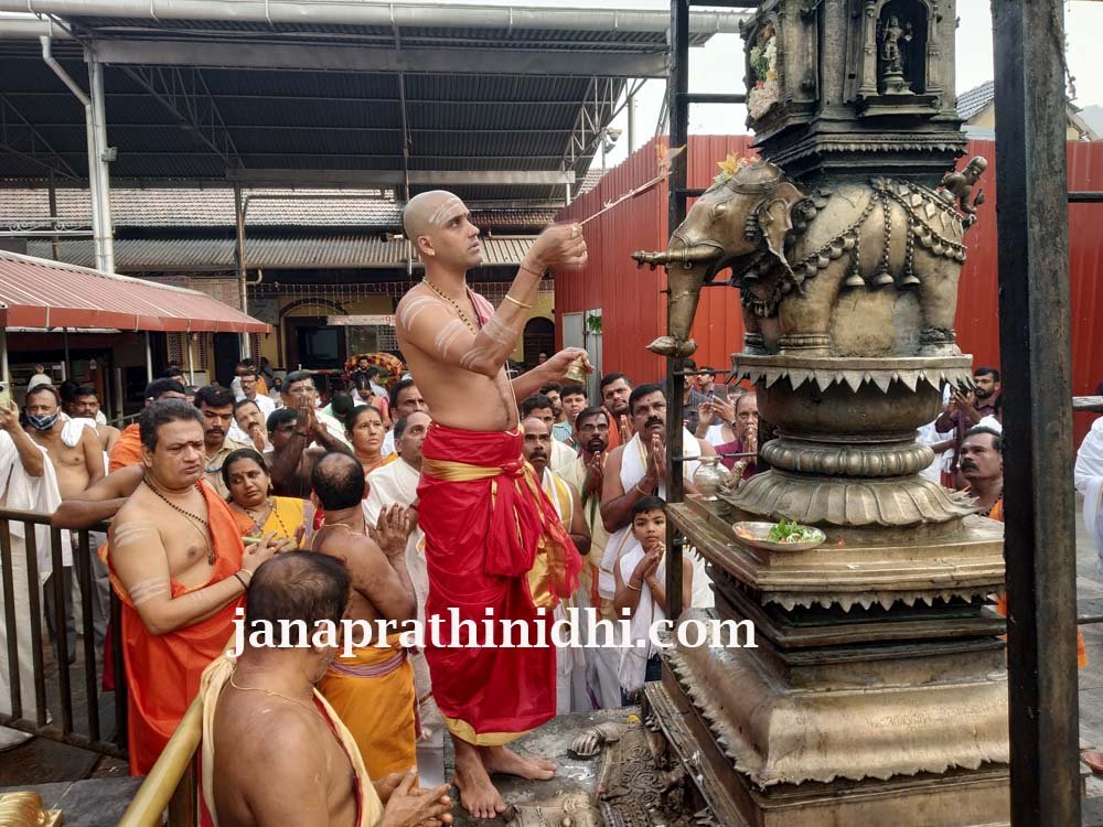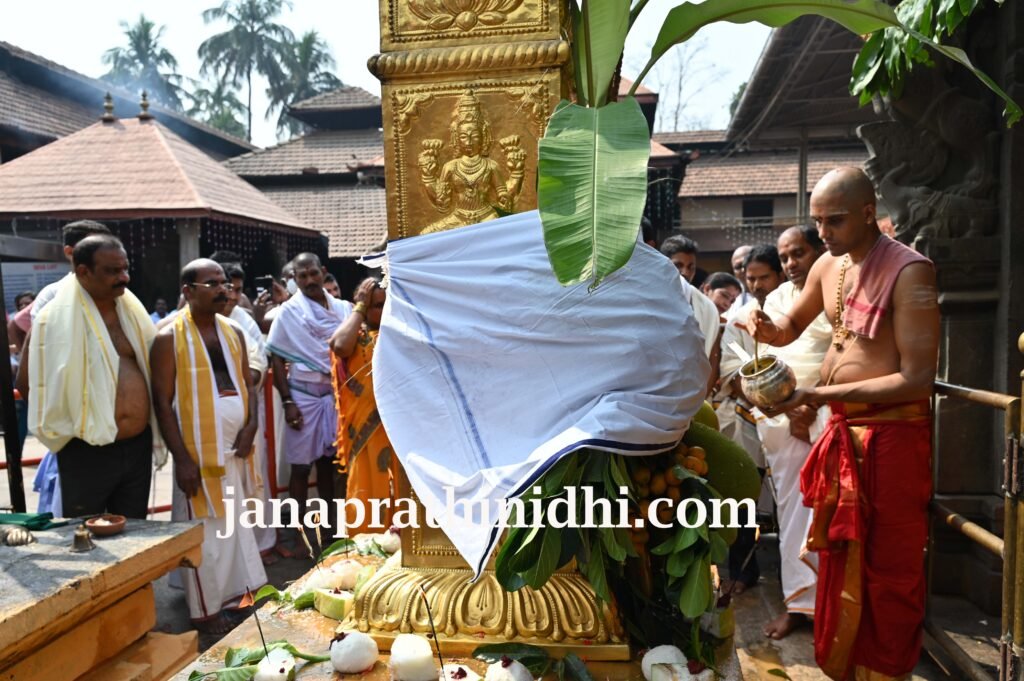 ಕೊಲ್ಲೂರು ಶ್ರೀ ಮೂಕಾಂಬಿಕಾ ದೇಗುಲದಲ್ಲಿ ಶುಕ್ರವಾರ ಬೆಳಿಗ್ಗೆ ದೇವಳದ ತಂತ್ರಿ ಡಾ.ರಾಮಚಂದ್ರ ಅಡಿಗ ನೇತೃತ್ವದಲ್ಲಿ ದೇವಳದ ಪಶ್ಚಿಮ ದ್ವಾರ (ಆನೆಬಾಗಿಲು)ಕ್ಕೆ ಚಿನ್ನದ ಲೇಪನದ ಶಿಖರ (ಸ್ವರ್ಣಕಲಶ) ಪ್ರತಿಷ್ಠೆ ಮಾಡಲಾಯಿತು. ಸಂಜೆ ಯಾಗಶಾಲಾ ಪ್ರವೇಶ, ರಜ್ಜು ಬಂಧನ, ಮೂಹೂರ್ತ ಬಲಿ, ಭೇರಿತಾಡನ, ಕೌತುಕ ಬಂಧನ ಹಾಗೂ ನಗರೋತ್ಸವ ನಡೆಯಿತು. ಮಾರ್ಚ್ 25ರ ಸಂಜೆ 5 ಗಂಟೆಗೆ ಮನ್ಮಹಾರಥೋತ್ಸವ ನಡೆಯಲಿದೆ.