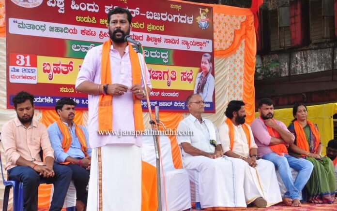 ಕುಂದಾಪುರ ಶಾಸ್ತ್ರೀ ಸರ್ಕಲ್ ಬಳಿ ವಿಶ್ವ ಹಿಂದೂ ಪರಿಷದ್ ಬಜರಂಗದಳ ಉಡುಪಿ ಜಿಲ್ಲೆ, ಕುಂದಾಪುರ ಪ್ರಖಂಡ ಕುಂದಾಪುರ ಲವ್ ಜಿಹಾದ್ ವಿರುದ್ಧ ನಡೆದ ಬೃಹತ್ ಪ್ರತಿಭಟನೆ, ಜಾಗೃತಿ ಸಭೆಯನ್ನು ಉದ್ದೇಶಿಸಿ ಮಾತನಾಡಿದರು.