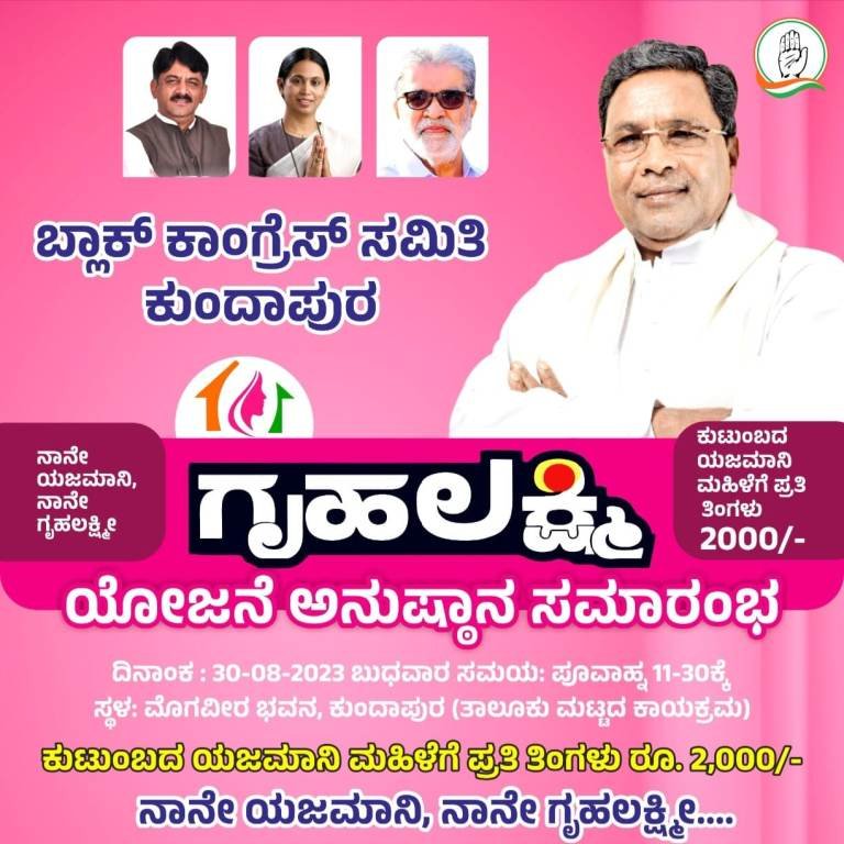 ಕುಂದಾಪುರ: ರಾಜ್ಯದಲ್ಲಿರುವ ಮಹಿಳೆಯರ ಆರ್ಥಿಕ ಸಬಲೀಕರಣದ ಉದ್ದೇಶದಿಂದ ಕುಟುಂಬ ದ ಯಜಮಾನಿ ಮಹಿಳೆಗೆ ಪ್ರತಿ ತಿಂಗಳು ತಲ ರೂ. 2000 ಗಳನ್ನು ನೀಡುವ ಗೃಹಲಕ್ಷ್ಮೀ ಯೋಜನೆಯನ್ನು ಕರ್ನಾಟಕದ ಸರ್ಕಾರ ಜಾರಿಗೆ ತಂದಿದೆ. ಈಗಾಗಲೇ ಯೋಜನೆಯಡಿ ನೋಂದಣಿ ಯಾಗಿರುವ ಫಲಾನುಭೂಮಿಗಳಿಗೆ ದಿನಾಂಕ: 30-08-2023 ರಂದು ಮೈಸೂರಿನಲ್ಲಿ ಗೃಹಲಕ್ಷ್ಮೀ ಯೋಜನೆಯನ್ನು ಮುಖ್ಯಮಂತ್ರಿಗಳು ಲೋಕಾರ್ಪಣೆಗೊಳಿಸಲಿದ್ದು, ಕಾರ್ಯಕ್ರಮಕ್ಕೆ ಎಲ್ಲಾ ಫಲಾನುಭೂಮಿಗಳು, ಸಾರ್ವಜನಿಕರು ,ಭಾಗಿಯಾಗಲು ಬ್ಲಾಕ್ ಕಾಂಗ್ರೆಸ್ ಕುಂದಾಪುರ ವ್ಯಾಪ್ತಿಯ ವಾರ್ಡ್ ಹಂತದಲ್ಲಿ ವ್ಯವಸ್ಥೆಯನ್ನು ಕಲ್ಪಿಸಲಾಗಿದೆ. ಈ ಕಾರ್ಯಕ್ರಮವನ್ನು ವೀಕ್ಷಣೆ ಮಾಡಲು ಟಿ.ವಿ/ ಎಲ್.ಇ.ಡಿ ಪರದೇ ವ್ಯವಸ್ಥಗೊಳಿಸಲಾಗುತ್ತದೆ. ಕಾರ್ಯಕ್ರಮಕ್ಕೆ ಸಾರ್ವಜನಿಕರು, ಫಲಾನುಭೂಮಿಗಳು, ಚುನಾಯಿತ ಜನಪ್ರತಿನಿಧಿಗಳು ಹಾಜರಾಗಬೇಕೆಂದು ವಿನಂತಿಸಲಾಗಿದೆ.