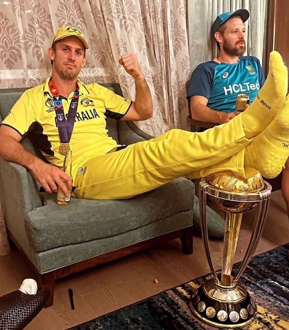 ಹೌದು, ಆಸಿಸ್‌ ಆಟಗಾರ ಮಿಚೆಲ್‌ ಮಾರ್ಷ್, ಕೈಯಲ್ಲಿ ಬಿಯರ್‌ ಬಾಟಲ್ ಹಿಡಿದು ಟ್ರೋಫಿಯ ಮೇಲೆ ಕಾಲು ಉದ್ದಕ್ಕೆ ಚಾಚಿ ಫೋಟೋಗೆ ಪೋಸ್‌ ಕೊಟ್ಟಿದ್ದಾರೆ. ಮಿಚೆಲ್‌ ಮಾರ್ಷ್‌ ಕೈಯಲ್ಲಿ ಬಿಯರ್‌ ಬಾಟಲ್‌ ಹಿಡದುಕೊಂಡು, ವಿಶ್ವಕಪ್‌ ಟ್ರೋಫಿಯ ಮೇಲೆ ಎರಡೂ ಕಾಲುಗಳನ್ನು ಚಾಚಿ ಸೋಫಾ ಮೇಲೆ ಕುಳಿತಿರುವುದನ್ನು ನೋಡಬಹುದು. ಈ ಫೋಟೋವನ್ನು ಆಸಿಸ್‌ ನಾಯಕ ಪ್ಯಾಟ್‌ ಕಮಿನ್ಸ್‌ ತಮ್ಮ ಇನ್ಸ್ಟಾಗ್ರಾಮ್‌ ನಲ್ಲಿ ಹಂಚಿಕೊಂಡಿದ್ದಾರೆ.