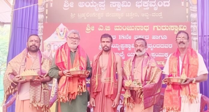 ಕುಂದಾಪುರ: ವಂಡ್ಸೆ ಸಮೀಪದ ಅಬ್ಬಿ ಚಿತ್ತೇರಿಯ ಶ್ರೀ ಬ್ರಹ್ಮಲಿಂಗೇಶ್ವರ ದೇವಸ್ಥಾನದಲ್ಲಿ ಶ್ರೀ ಅಯ್ಯಪ್ಪ ಸ್ವಾಮಿ ಭಕ್ತವೃಂದದ ಎ.ಜಿ ಮಂಜುನಾಥ ಗುರುಸ್ವಾಮಿ ಇವರ 18ನೇ ವರ್ಷದ ಹಾಗೂ ಅಯ್ಯಪ್ಪ ಭಕ್ತವೃಂದದವರ ಶಬರಿಮಲೈ ಯಾತ್ರೆಯ ಪ್ರಯುಕ್ತ ಗುರುವಂದನೆ ಕಾರ್ಯಕ್ರಮ ಜರಗಿತು.