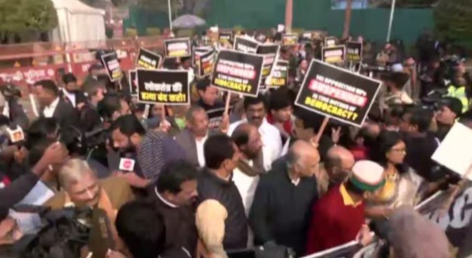 ಲೋಕಸಭೆ ಮತ್ತು ರಾಜ್ಯಸಭೆಯಿಂದ 143 ವಿರೋಧ ಪಕ್ಷದ ಸಂಸದರನ್ನು ಅಮಾನತುಗೊಳಿಸಿರುವುದನ್ನು ವಿರೋಧಿಸಿ ವಿರೋಧ ಪಕ್ಷಗಳ ನಾಯಕರು ಸಂಸತ್ತಿನಿಂದ ವಿಜಯ್ ಚೌಕ್‌ ತನಕ ಪ್ರತಿಭಟನಾ ಮೆರವಣಿಗೆ ನಡೆಸಿದರು. ‘Parliament caged, democracy expelled ಎಂಬ ಫಲಕಗಳನ್ನು ಹಿಡಿದು ಪ್ರತಿಭಟನಾ ಮೆರವಣಿಗೆ ನಡೆಸಿದರು. ಭಾರತದ ಇತಿಹಾಸದಲ್ಲೇ ಇಂತಹದ್ದೊಂದು ಘಟನೆ ಈವರೆಗೆ ನಡೆದಿರಲಿಲ್ಲ  ಎನ್ನುವುದು ಇಲ್ಲಿ ಉಲ್ಲೇಖಾರ್ಹ.