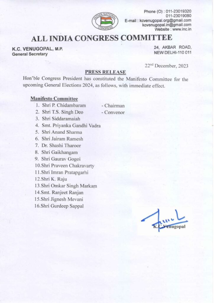 ಕಾಂಗ್ರೆಸ್‌ ನ ಹಿರಿಯ ನಾಯಕ ಪಿ. ಚಿದಂಬರಂ  ‘ಕಾಂಗ್ರೆಸ್ ಪಕ್ಷದ ಪ್ರಣಾಳಿಕೆ ರಚನಾ ಸಮಿತಿ’ಯ ಚೇರ್‌ಮನ್‌ ಆಗಿರಲಿದ್ದು, ಸಮನ್ವಯಕಾರರಾಗಿ ಟಿ.ಎಸ್‌ ಸಿಂಗ್‌ ಇರಲಿದ್ದಾರೆ. ಉಳಿದಂತೆ ರಾಜ್ಯದ ಮುಖ್ಯಮಂತ್ರಿ ಸಿದ್ದರಾಮಯ್ಯ, ಪ್ರಿಯಾಂಕ ಗಾಂಧಿ ವಾದ್ರಾ, ಆನಂದ್‌ ಶರ್ಮಾ, ಜೈರಾಮ್‌ ರಮೇಶ್‌, ಶಶಿ ತರೂರ್‌, ಗೈಖಂಗಮ್‌ ಗಾಂಗ್ಮಿ, ಗೌರವ್‌ ಗೊಗೊಯ್‌, ಪ್ರವೀಣ್‌ ಚಕ್ರವರ್ತಿ, ಇಮ್ರಾನ್‌ ಪ್ರತಾಪ್ಗರ್ಹಿ, ಕೆ. ರಾಜು, ಓಂಕಾರ್‌  ಸಿಂಗ್‌, ರಣಜಿತ್‌ ರಂಜನ್‌, ಜಿಗ್ನೇಶ್‌ ಮೇವಾನಿ ಹಾಗೂ ಗುರುದೀಪ್‌ ಸಪ್ಪಲ್‌ ಅವರನ್ನೊಳಗೊಂಡ ಸಮಿತಿಯನ್ನು ಹೈಕಮಾಂಡ್‌ ರಚಿಸಿದೆ.