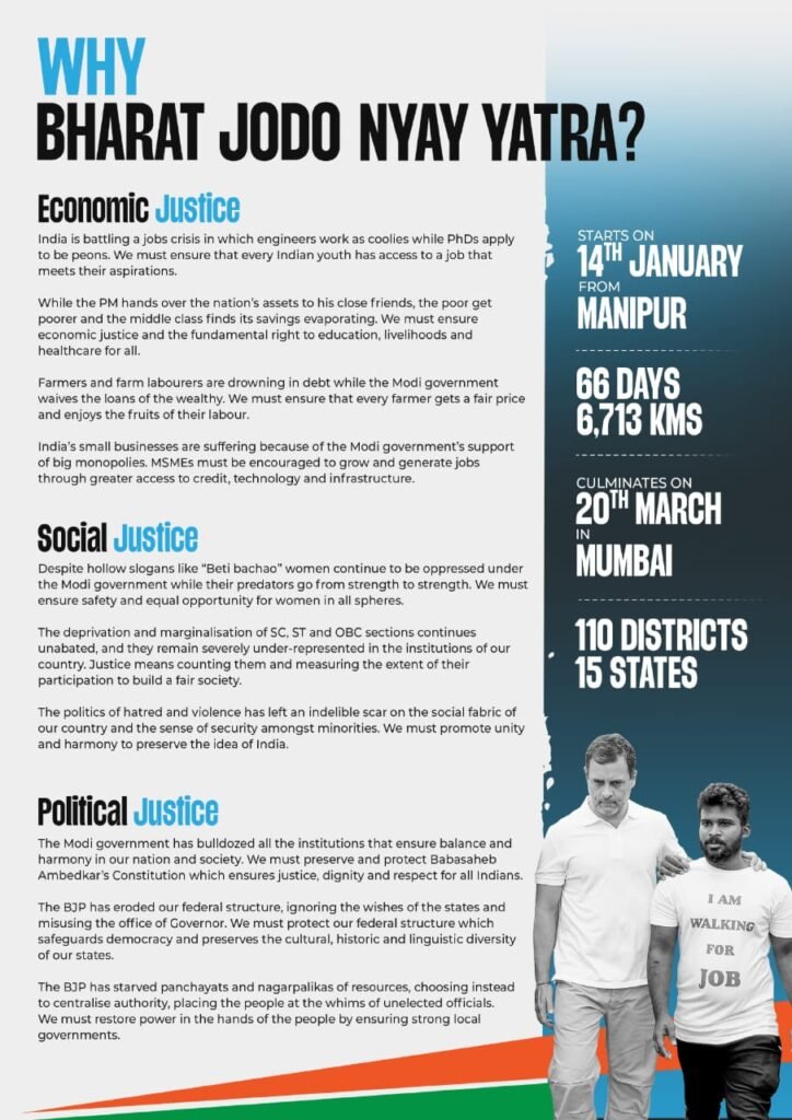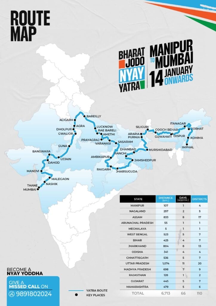 14 ಜನವರಿಯಂದು ಮಣಿಪುರದಿಂದ ಆರಂಭವಾಗುವ ಭಾರತ್‌ ಜೋಡೋ ನ್ಯಾಯ್‌ ಯಾತ್ರೆ 66 ದಿನಗಳ ಕಾಲ ನಡೆಯಲಿಕ್ಕಿದ್ದು ಸುಮಾರು 6,713 ಕಿ.ಲೋ ಮೀಟರ್‌ನಷ್ಟು ದೂರ ಯಾತ್ರೆ ಸಾಗಿ ಮಾರ್ಚ್‌ 20 ರಂದು ಮುಂಬೈನಲ್ಲಿ ಕೊನೆಗೊಳ್ಳಲಿದೆ. 66 ದಿನಗಳು ನಡೆಯಲಿರುವ ಕಾಂಗ್ರೆಸ್‌ ಯಾತ್ರೆ 15 ರಾಜ್ಯಗಳ 110 ಜಿಲ್ಲೆಗಳನ್ನು ತಲುಪಲಿದೆ ಎಂದು ರಾಷ್ಟ್ರೀಯ ಕಾಂಗ್ರೆಸ್‌ ಮಾಹಿತಿ ಹಂಚಿಕೊಂಡಿದೆ.