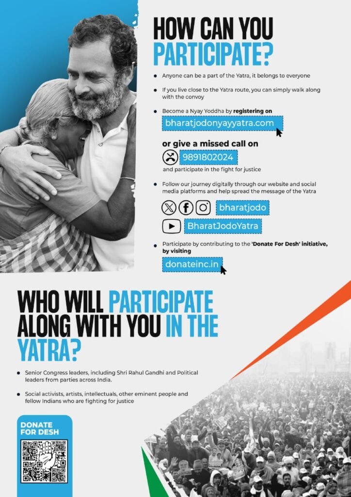 ಇನ್ನು, ಕಾಂಗ್ರೆಸ್‌ ಯಾತ್ರೆಯಲ್ಲಿ ಭಾಗವಹಿಸುವುದಕ್ಕೆ ಎಲ್ಲರಿಗೂ ಅವಕಾಶ ನೀಡಿದ್ದು, ಯಾತ್ರೆಯ ಮಾರ್ಗಕ್ಕೆ ನೀವು ಸಮೀಪದಲ್ಲೇ ಇದ್ದರೇ ನಮ್ಮೊಂದಿಗೆ ಹೆಜ್ಜೆ ಹಾಕಿ ಎಂದು ಕರೆ ನೀಡಿದೆ. ಭಾರತ್‌ ಜೋಡೋ ನ್ಯಾಯ್‌ ಯಾತ್ರೆಯ ʼಯೋಧʼನಾಗುವುದಕ್ಕೆ ಇಚ್ಛಿಸಿದ್ದಲ್ಲಿ bharatjodonyayyatra.com ಮೂಲಕ ನೊಂದಾಯಿಸಿಕೊಳ್ಳಬಹುದು ಅಥವಾ  9891802024 ನಂಬರ್‌ ಗೆ ಮಿಸ್ಡ್‌ ಕಾಲ್‌ ಕೊಡಬಹುದು ಎಂದೂ ಹೇಳಿದೆ.