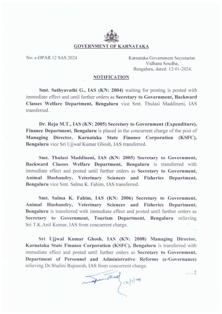 ಸ್ಥಳ ನಿಯುಕ್ತಿಯ ನಿರೀಕ್ಷೆಯಲ್ಲಿದ್ದ ಸತ್ಯವತಿ ಜಿ. ಅವರನ್ನು ಹಿಂದುಳಿದ ವರ್ಗಗಳ ಕಲ್ಯಾಣ ಇಲಾಖೆಯ ಕಾರ್ಯದರ್ಶಿಯಾಗಿ, ಹಣಕಾಸು ಇಲಾಖೆಯ ಕಾರ್ಯದರ್ಶಿ ಡಾ.ರೇಜು ಎಂ.ಟಿ. ಅವರನ್ನು ರಾಜ್ಯ ಹಣಕಾಸು ನಿಗಮದ ವ್ಯವಸ್ಥಾಪಕ ನಿರ್ದೇಶಕರಾಗಿ, ಹಿಂದುಳಿದ ವರ್ಗಗಳ ಕಲ್ಯಾಣ ಇಲಾಖೆಯ ಕಾರ್ಯದರ್ಶಿ ತುಳಸಿ ಮದ್ದಿನೇನಿ ಅವರನ್ನು ಪಶುಸಂಗೋಪನೆ ಹಾಗೂ ಮೀನುಗಾರಿಕೆ ಇಲಾಖೆಯ ಕಾರ್ಯದರ್ಶಿಯಾಗಿ ವರ್ಗಾವಣೆ ಮಾಡಲಾಗಿದೆ.