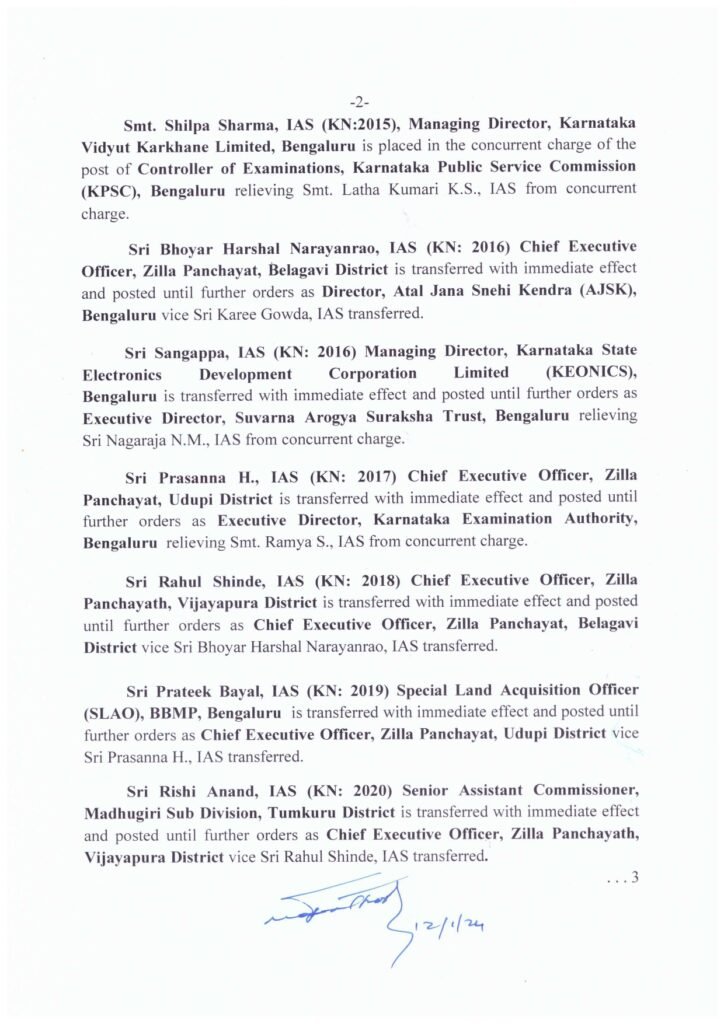 ರಾಜ್ಯ ವಿದ್ಯುತ್ ಕಾರ್ಖಾನೆ ನಿಯಮಿತದ ವ್ಯವಸ್ಥಾಪಕ ನಿರ್ದೇಶಕಿ ಶಿಲ್ಪಾ ಶರ್ಮಾ ಅವರನ್ನು ರಾಜ್ಯ ಲೋಕಸೇವಾ ಆಯೋಗದ ಪರೀಕ್ಷಾ ನಿಯಂತ್ರಕಿಯಾಗಿ, ಬೆಳಗಾವಿ ಜಿಲ್ಲಾ ಪಂಚಾಯಿತಿ ಮುಖ್ಯ ಕಾರ್ಯನಿರ್ವಾಹಕ ಅಧಿಕಾರಿ ಭೋಯರ್ ಹರ್ಷಲ್ ನಾರಾಯಣರಾವ್ ಅವರನ್ನು ಅಟಲ್ ಜನ ಸ್ನೇಹಿ ಕೇಂದ್ರದ ನಿರ್ದೇಶಕರನ್ನಾಗಿ ವರ್ಗಾವಣೆ ಮಾಡಲಾಗಿದೆ.