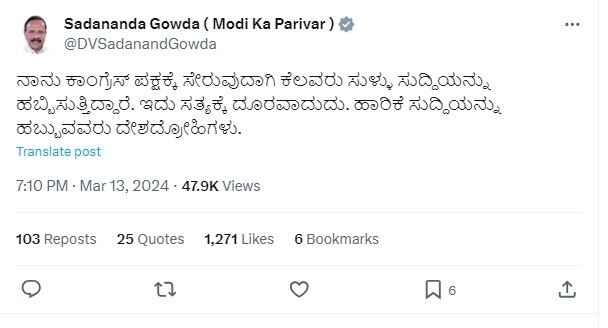 ಇನ್ನು, ಈ ಊಹಾಪೋಹಗಳು ಹರಿದಾಡುತ್ತಿರುವುದರ ನಡುವೆ ಡಿ.ವಿ ಸದಾನಂದ ಗೌಡ ಅವರು ತಮ್ಮ ಅಧಿಕೃತ ಎಕ್ಸ್‌ ಖಾತೆಯಲ್ಲಿ ʼನಾನು ಕಾಂಗ್ರೆಸ್ ಪಕ್ಷಕ್ಕೆ ಸೇರುವುದಾಗಿ ಕೆಲವರು ಸುಳ್ಳು ಸುದ್ದಿಯನ್ನು ಹಬ್ಬಿಸುತ್ತಿದ್ದಾರೆ. ಇದು ಸತ್ಯಕ್ಕೆ ದೂರವಾದುದು. ಹಾರಿಕೆ ಸುದ್ದಿಯನ್ನು ಹಬ್ಬುವವರು ದೇಶದ್ರೋಹಿಗಳು.ʼ ಎಂದು ಮಾರ್ಚ್‌ 13, 2024 ರಂದು ಬರೆದುಕೊಂಡಿದ್ದರು ಎನ್ನುವುದು ಇಲ್ಲಿ ಉಲ್ಲೇಖಾರ್ಹ.