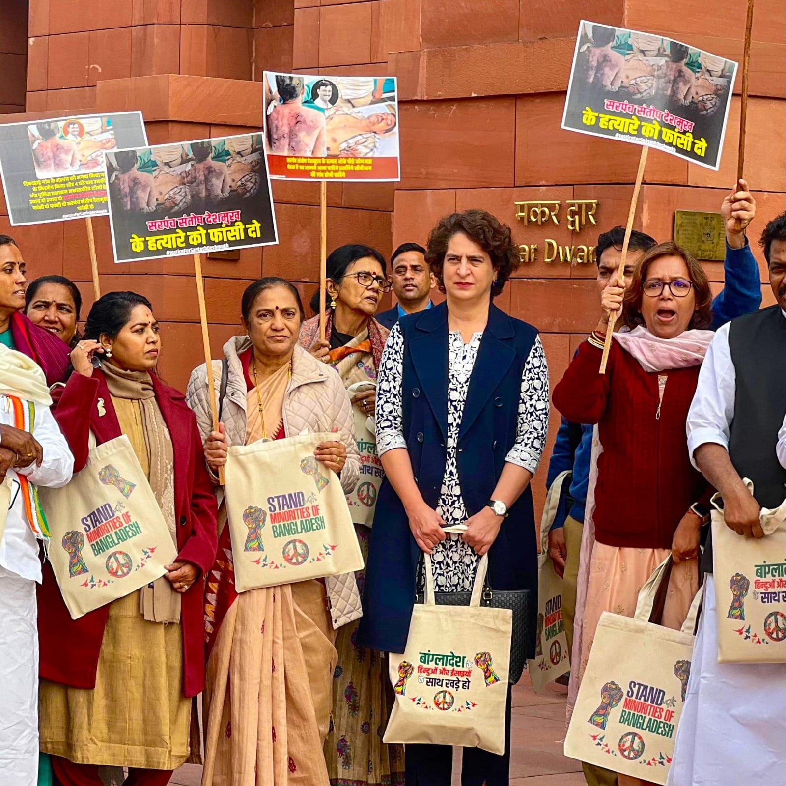 ಕಾಂಗ್ರೆಸ್ ಪಕ್ಷದ ಪ್ರಧಾನ ಕಾರ್ಯದರ್ಶಿ ಪ್ರಿಯಾಂಕಾ ಗಾಂಧಿ ಒಳಗೊಂಡಂತೆ ಹಲವು ಕಾಂಗ್ರೆಸ್ ಸಂಸದರು ಈ ಪ್ರತಿಭಟನೆಯಲ್ಲಿ ಭಾಗವಹಿಸಿದ್ದರು. ಬಾಂಗ್ಲಾದೇಶದಲ್ಲಿರುವ ಹಿಂದೂ ಅಲ್ಪಸಂಖ್ಯಾತರ ಸುರಕ್ಷತೆಗಾಗಿ ಕೇಂದ್ರ ಸರ್ಕಾರ ದೃಢವಾದ ಕ್ರಮಗಳನ್ನು ಕೈಗೊಳ್ಳಬೇಕು ಎಂದು ಪ್ರತಿಭಟನಾಕಾರರು ಒತ್ತಾಯಿಸಿದರು.