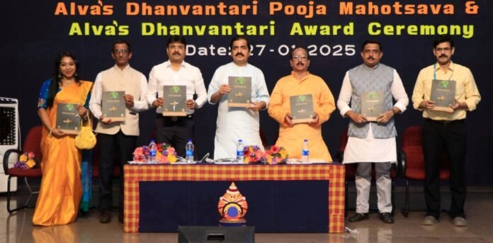 ಆಳ್ವಾಸ್‌ನ ವಿ.ಎಸ್. ಆಚಾರ್ಯ ಸಭಾಂಗಣದಲ್ಲಿ ಇಂದು ನಡೆದ ಆಯುರ್ವೇದ ಕಾಲೇಜಿನ ಆಳ್ವಾಸ್ ‘ಧನ್ವಂತರಿ ಪೂಜಾ ಮಹೊತ್ಸವ’, ಶಿಶ್ಯೋಪನಯನ ಸಂಸ್ಕಾರ ಹಾಗೂ ಆಳ್ವಾಸ್ ಧನ್ವಂತರಿ ಪ್ರಶಸ್ತಿ ವಿತರಣಾ  ಸಮಾರಂಭದಲ್ಲಿ ಅಧ್ಯಕ್ಷತೆವಹಿಸಿ ಮಾತನಾಡುತ್ತಾ ಆಯುವೇದದಲ್ಲಿ ಉಜ್ವಲ ಭವಿಷ್ಯವಿದ್ದು, ಅದನ್ನು ಅಂತರಾಷ್ಟಿçÃಯ ಮಟ್ಟದಲ್ಲಿ ಪರಿಚಯಿಸುವ ಅಗತ್ಯವಿದೆ. ಈ ನಿಟ್ಟಿನಲ್ಲಿ ವಿದ್ಯಾರ್ಥಿಗಳು, ಉಪನ್ಯಾಸಕರು ಹೆಚ್ಚು ಹೆಚ್ಚು ಸಂಶೋಧನೆಗೆ ಒತ್ತು ಕೊಡಬೇಕು. ಕಾಲೇಜಿನಲ್ಲಿ ಕಲಿತ ವಿದ್ಯೆ ಕೇವಲ ಮೆದುಳಿಗೆ ಜ್ಞಾನವನ್ನು ಕೊಡುತ್ತದೆ. ತರಗತಿಯ ಹೊರಗೆ ಕಲಿತ ಬಯಲು ಶಿಕ್ಷಣ ಪ್ರಾಯೋಗಿಕತೆಯಿಂದ ಕೂಡಿದ್ದು, ಅದು ಶ್ರೇಷ್ಠ ಜ್ಞಾವನ್ನಾಗಿಸುತ್ತದೆ. ಆಯುರ್ವೇದದಲ್ಲಿರುವ ವಿಫುಲ ಅವಕಾಶಗಳನ್ನು ಅರ್ಥಮಾಡಿಕೊಂಡು ಭವಿಷ್ಯವನ್ನು ರೂಪಿಸಿಕೊಳ್ಳಿ ಎಂದು ವಿದ್ಯಾರ್ಥಿಗಳಿಗೆ ಕರೆ ನೀಡಿದರು.