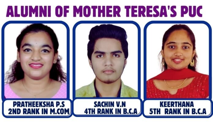 ಕುಂದಾಪುರ : ತಾಲೂಕಿನ ಪ್ರತಿಷ್ಠಿತ ವಿದ್ಯಾಸಂಸ್ಥೆ ಮದರ್ ತೆರೇಸಾಸ್ ಪದವೀಪೂರ್ವ ಕಾಲೇಜು ಶಂಕರನಾರಾಯಣ ಇಲ್ಲಿ ವ್ಯಾಸಂಗ ಮಾಡಿದ ಹಳೆ ವಿದ್ಯಾರ್ಥಿಗಳಿಂದ ಮಂಗಳೂರು ವಿ ವಿ ಪರೀಕ್ಷೆಯಲ್ಲಿ ಭರ್ಜರಿ ಸಾಧನೆ ಮಾಡಿದ್ದಾರೆ.