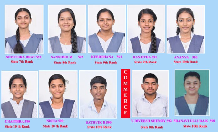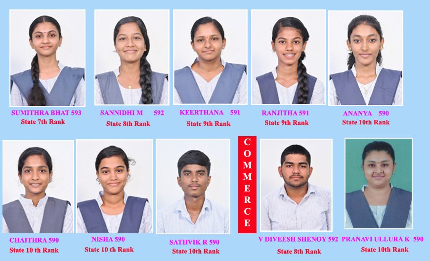 ವಾಣಿಜ್ಯ ವಿಭಾಗ ದಲ್ಲಿ  ವಿ. ದಿವೀಶ್ ಶೆಣೈ (592) 8 ನೇ ರ್‍ಯಾಂಕ್, ಪ್ರಣವಿ ಉಳ್ಳೂರ್. ಕೆ (590)  10 ನೇ ರ್‍ಯಾಂಕ್ ಪಡೆದುಕೊಳ್ಳುವುದರ ಮೂಲಕ ಸಾಧನೆ ಮೆರೆದಿದ್ದಾರೆ.