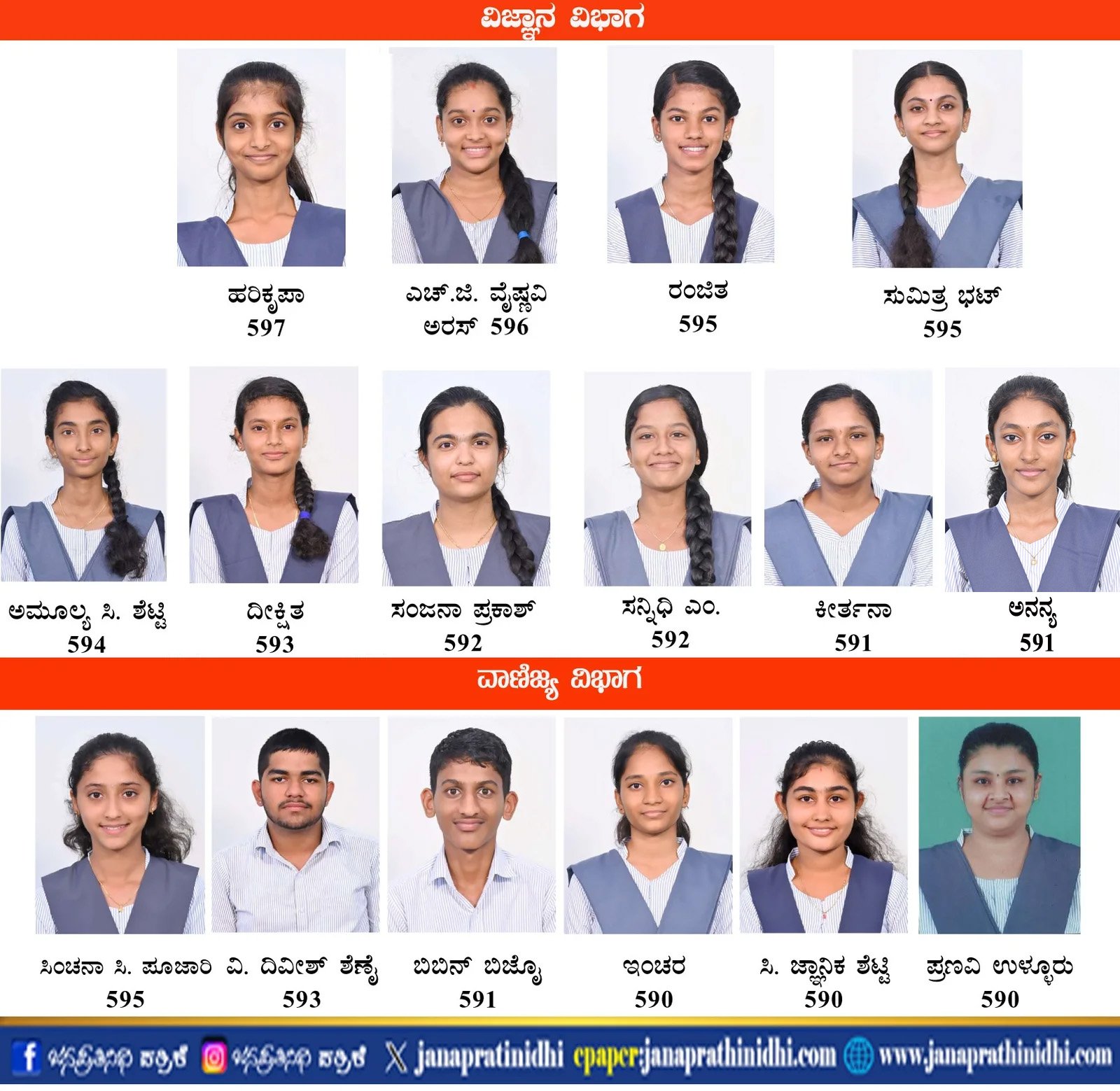 h.s ವೈಷ್ಣವಿ ಅರಸ್ (596) 5ನೇ Rank, ರಂಜಿತಾ ,ಸುಮಿತ್ರಾ ಭಟ್ (595) 6ನೇ Rank , ಅಮೂಲ್ಯ ಅ ಶೆಟ್ಟಿ (594) 7ನೇ Rank , ದೀಕ್ಷಿತಾ (593)8 ನೇ Rank, ಸಂಜನಾ ಪ್ರಕಾಶ್, ಸನ್ನಿಧಿ m (592) 9ನೇ Rank, ಕೀರ್ತನಾ (591) 10 ನೇ Rank, ಅನನ್ಯ (591) 10 ನೇ Rank  ಪಡೆದುಕೊಂಡಿದ್ದಾರೆ.