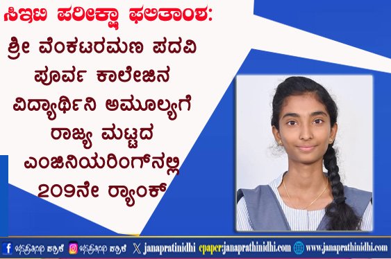 ಸಿಇಟಿ ಪರೀಕ್ಷಾ ಫಲಿತಾಂಶ: ಶ್ರೀ ವೆಂಕಟರಮಣ ಪದವಿ ಪೂರ್ವ ಕಾಲೇಜಿನ ವಿದ್ಯಾರ್ಥಿನಿ ಅಮೂಲ್ಯಗೆ ರಾಜ್ಯ ಮಟ್ಟದ ಎಂಜಿನಿಯರಿಂಗ್ ನಲ್ಲಿ   209ನೇ Rank