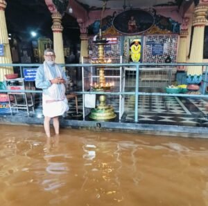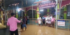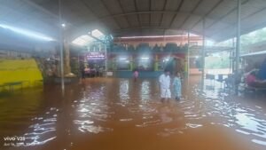 ಮಾರಣಕಟ್ಟೆ: ಮುಂಗಾರು ಮಳೆಯ ಆರ್ಭಟಕ್ಕೆ ಮೊದಲ ನೆರೆ ಕಾಣಿಸಿಕೊಂಡಿದೆ. ಶನಿವಾರದಿಂದ ಸುರಿಯುತ್ತಿರುವ ಮಳೆಗೆ ಚಕ್ರಾನದಿ ತುಂಬಿ ಹರಿಯುತ್ತಿದ್ದು, ಮಾರಣಕಟ್ಟೆ ಶ್ರೀ ಬ್ರಹ್ಮಲಿಂಗೇಶ್ವರ ದೇವಸ್ಥಾನದ ಪ್ರಾಂಗಣದ ಒಳಗೆ ನೀರು ನುಗ್ಗಿದೆ.