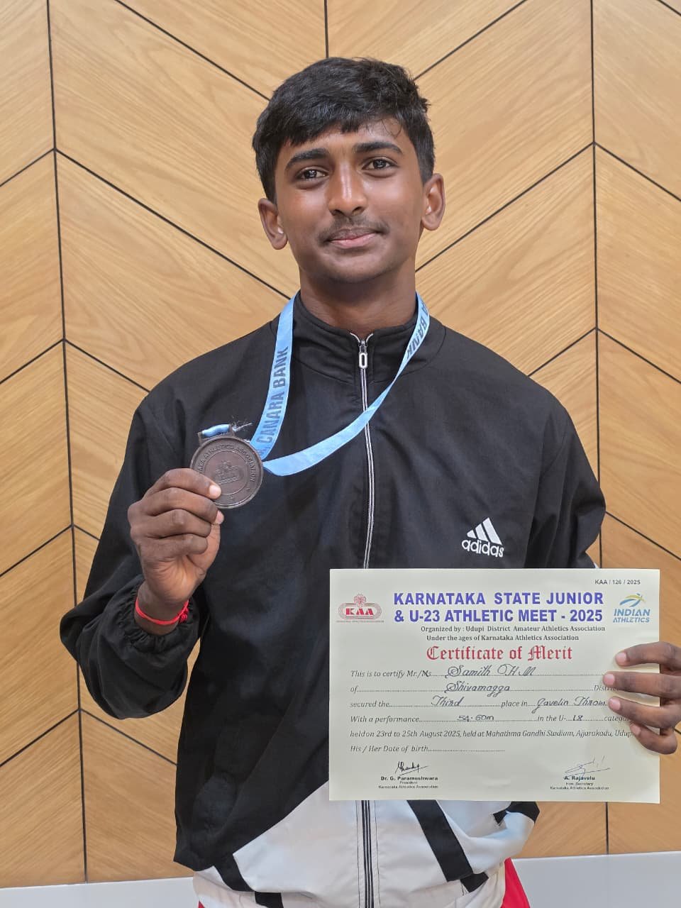 ಕುಂದಾಪುರ: ಉಡುಪಿ ಜಿಲ್ಲೆ ಅಮೆಚೂರ್ ಅಥ್ಲೆಟಿಕ್ ಅಸೋಸಿಯೇಷನ್ ಉಡುಪಿ ಇವರು ಅಜ್ಜರಕಾಡಿನ ಮಹಾತ್ಮಗಾಂಧಿ ಜಿಲ್ಲಾ ಕ್ರೀಡಾಂಗಣದಲ್ಲಿ ಆಯೋಜಿಸಿದ್ದ ರಾಜ್ಯಮಟ್ಟದ ಜೂನಿಯರ್ ಮತ್ತು ಸೀನಿಯರ್-೨೩ ಅಥ್ಲೆಟಿಕ್ ಮೀಟ್-೨೦೨೫ರಲ್ಲಿ ಸುಜ್ಞಾನ ಪದವಿಪೂರ್ವ ಕಾಲೇಜಿನ ಸಮಿತ್ ಜಾವೆಲಿನ್ ಎಸೆತದಲ್ಲಿ ಮೂರನೇ ಸ್ಥಾನ ಗಳಿಸಿದ್ದಾನೆ.