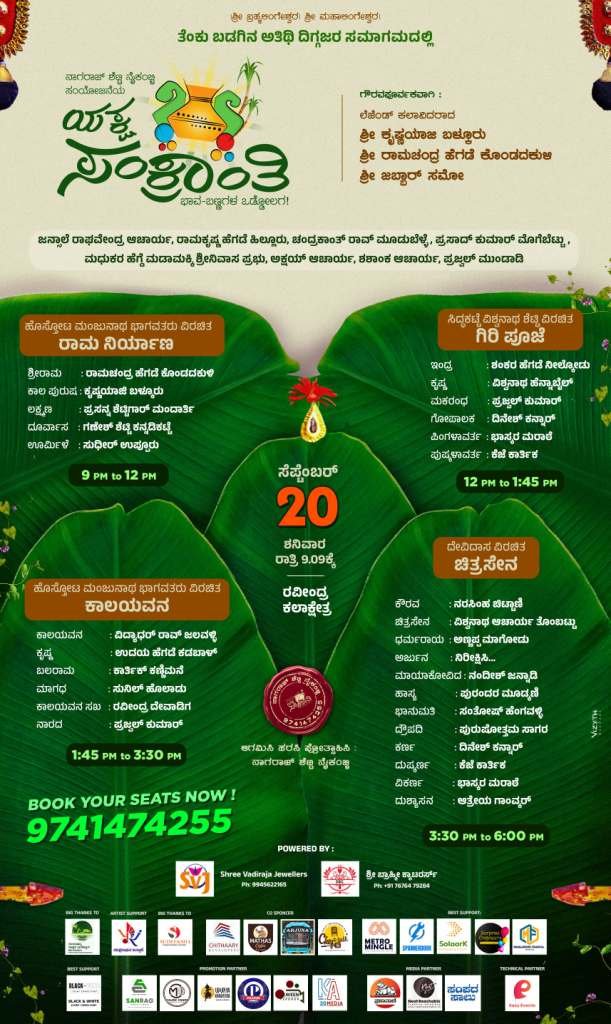ಸೆ.20ಕ್ಕೆ ಬೆಂಗಳೂರಿನಲ್ಲಿ ಯಕ್ಷಸಂಕ್ರಾಂತಿ : ತೆಂಕು-ಬಡಗಿನ ಅಗ್ರಮಾನ್ಯ ಕಲಾವಿದರ ಕೂಡುವಿಕೆಯಲ್ಲಿ ಅಪರೂಪದ ಪ್ರಸಂಗಗಳ ಅದ್ದೂರಿ ಪ್ರದರ್ಶನ