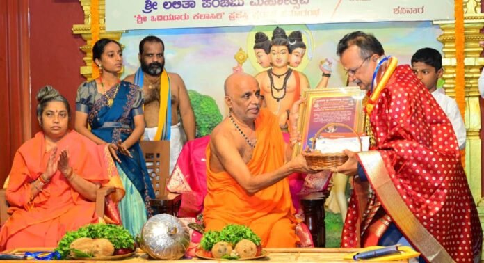 ಕುಂದಾಪುರ: ಒಡಿಯೂರು ಕ್ಷೇತ್ರದಲ್ಲಿ ಶ್ರೀ ಲಲಿತಾ ಪಂಚಮಿ ಹಾಗೂ ಶ್ರೀ ಚಂಡಿಕಾ ಯಾಗದ ಶುಭ ಸಂದರ್ಭದಲ್ಲಿ ಸಿರಿಬಾಗಿಲು ವೆಂಕಪ್ಪಯ್ಯ ಸಾಂಸ್ಕೃತಿಕ ಪ್ರತಿಷ್ಠಾನದ ಅಧ್ಯಕ್ಷರು ಹಾಗೂ ಶ್ರೀ ಧರ್ಮಸ್ಥಳ ಮೇಳದ ಯಕ್ಷಗಾನ ಭಾಗವತರಾದ ರಾಮಕೃಷ್ಣ ಮಯ್ಯ ಸಿರಿಬಾಗಿಲು ಇವರಿಗೆ ಶ್ರೀ ಗುರುದೇವಾನಂದ ಸ್ವಾಮೀಜಿಯವರು ‘ಕಲಾ ಸಿರಿ’ ಪ್ರಶಸ್ತಿ ನೀಡಿ ಗೌರವಿಸಿದರು.
