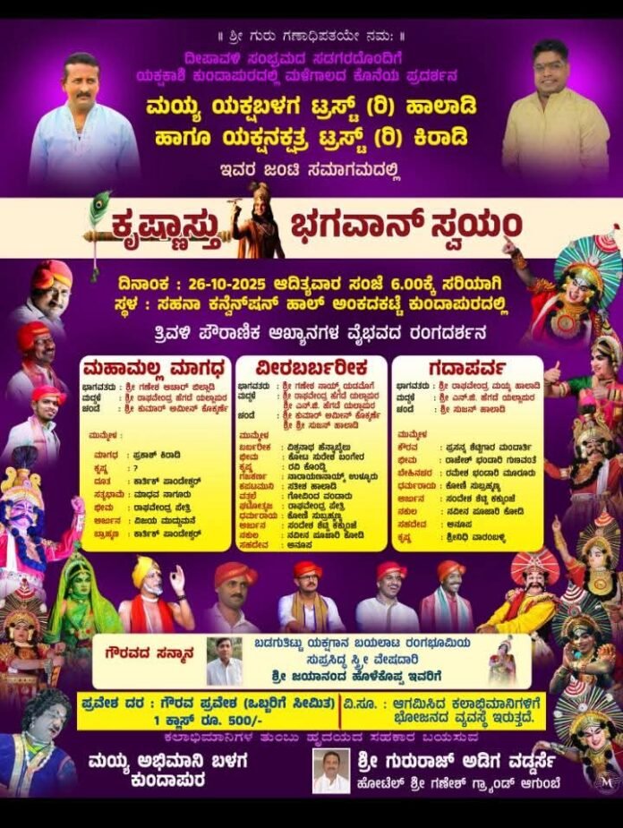 ಕುಂದಾಪುರ: ಮಯ್ಯ ಯಕ್ಷಬಳಗ ಟ್ರಸ್ಟ್ ಹಾಲಾಡಿ ಹಾಗೂ ಯಕ್ಷನಕ್ಷತ್ರ ಟ್ರಸ್ಟ್ ಕಿರಾಡಿ ಇವರ ಜಂಟಿ ಸಮಾಗಮದಲ್ಲಿ ಕುಂದಾಪುರ ಅಂಕದಕಟ್ಟೆ ಸಹನಾ ಕನ್ವನ್ಶನ್ ಹಾಲ್ ನಲ್ಲಿ ಅ.26, ಸಂಜೆ 6 ಗಂಟೆಯಿಂದ ‘ಕೃಷ್ಣಾಸ್ತು ಭಗವಾನ್ ಸ್ವಯಂ’ ತ್ರಿವಳಿ ಪೌರಾಣಿಕ ಆಖ್ಯಾನಗಳ ವೈಭವದ ರಂಗದರ್ಶನ ನಡೆಯಲಿದೆ.