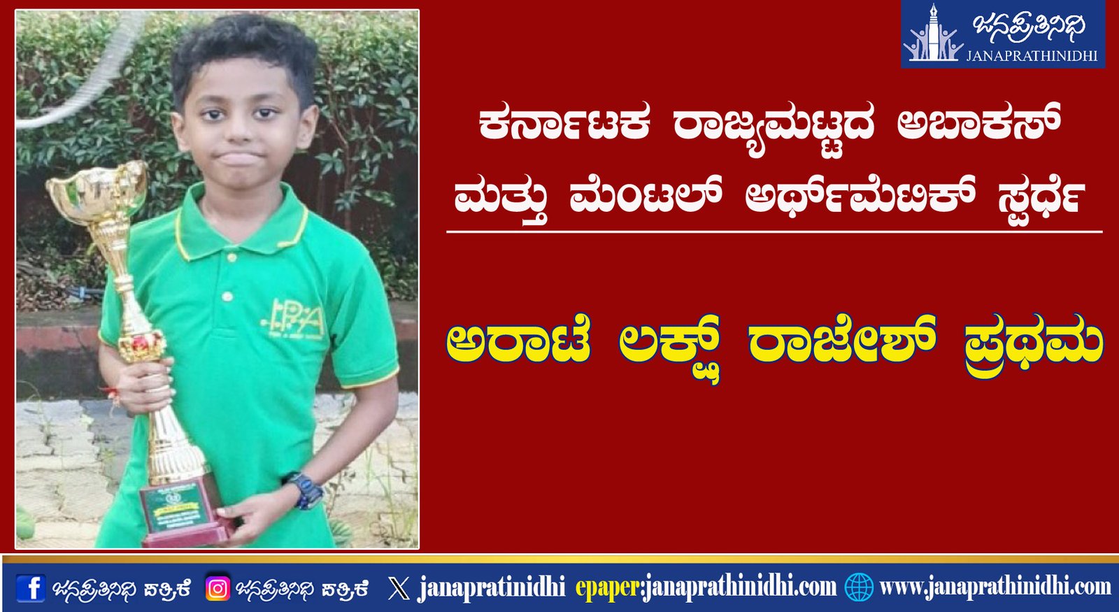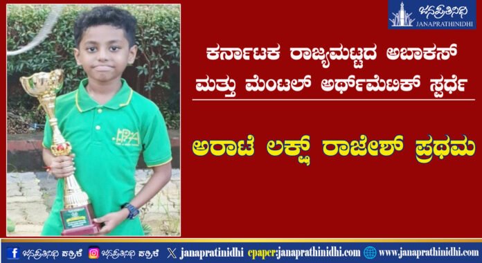 ರಾಜ್ಯಮಟ್ಟದ ಅಬಾಕಸ್ ಮತ್ತು ಮೆಂಟಲ್ ಅರ್ಥ್‌ಮೆಟಿಕ್-2025ರ ಸ್ಪರ್ಧೆಯಲ್ಲಿ ಅರಾಟೆ ಲಕ್ಷ್ ರಾಜೇಶ್ ಪ್ರಥಮ
