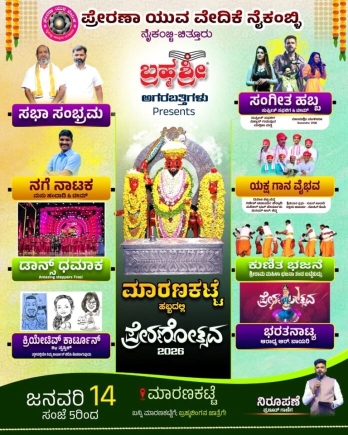 ಕುಂದಾಪುರ: ಪ್ರೇರಣ ಯುವ ವೇದಿಕೆ ನೈಕಂಬ್ಳಿ-ಚಿತ್ತೂರು ಇವರ ನೇತೃತ್ವದಲ್ಲಿ ಬ್ರಹ್ಮಶ್ರೀ ಆಗರಬತ್ತಿಗಳು ಅರ್ಪಿಸುವ ಮಾರಣಕಟ್ಟೆ ಹಬ್ಬದಲ್ಲಿ ಪ್ರೇರಣೋತ್ಸವ 2026 ಕಾರ್ಯಕ್ರಮ ಜನವರಿ 14 ಬುಧವಾರ ಸಂಜೆ 5 ಗಂಟೆಯಿಂದ ನೆಡೆಯಲಿದೆ.