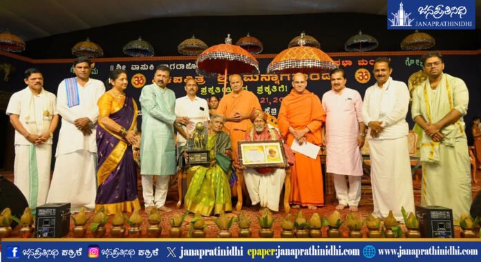ಹೆಬ್ರಿ: ಮುನಿಯಾಲು ಸಂಜೀವಿನಿ ಗೋಧಾಮದಲ್ಲಿ ನಡೆಯುತ್ತಿರುವ ಏಕಪವಿತ್ರ ಶ್ರೀಮನ್ನಾಗಮಂಡಲದ ಮೊದಲ ಫೆ. 20ರಂದು ಸಂಜೆ ಶ್ರೀನಿವಾಸ ಸಭಾ ಮಂಟಪದಲ್ಲಿ ನಡೆದ ಕಾರ್ಯಕ್ರಮದಲ್ಲಿ ಅಪರೂಪದ ಕೃಷಿ ಸಾಧಕ, ಕೃಷಿ‌ಋಷಿ ಬಿ.ಕೆ.ದೇವರಾಯ ಮಿತ್ತಬಾಗಿಲು ಅವರಿಗೆ ರೈತಪೀಠ ಪ್ರಶಸ್ತಿ ನೀಡಿ ಗೌರವಿಸಲಾಯಿತು.