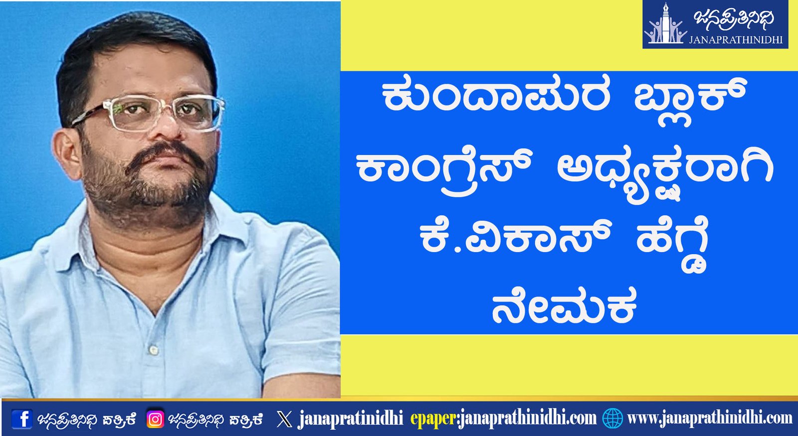 ಕುಂದಾಪುರ: ಕುಂದಾಪುರ ಬ್ಲಾಕ್ ಕಾಂಗ್ರೆಸ್ ಸಮಿತಿಯ ನೂತನ ಅಧ್ಯಕ್ಷರಾಗಿ ಕೆ.ವಿಕಾಸ್ ಹೆಗ್ಡೆ ಅವರನ್ನು ನೇಮಕಗೊಳಿಸಿ ಕೆಪಿಸಿಸಿ ರಾಜ್ಯಾಧ್ಯಕ್ಷರಾದ ಡಿ.ಕೆ ಶಿವಕುಮಾರ್ ಆದೇಶ ಹೊರಡಿಸಿದ್ದಾರೆ.