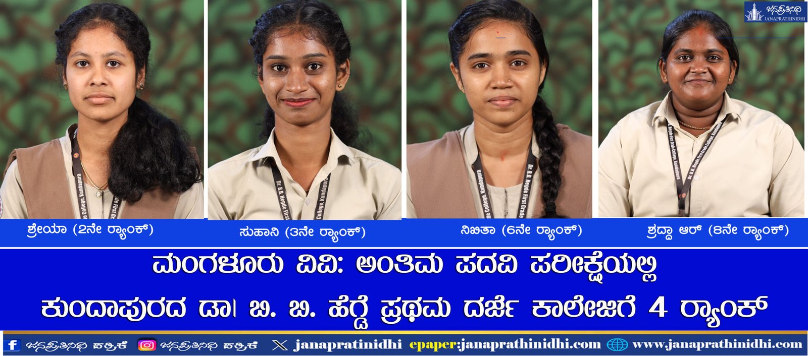 ಕುಂದಾಪುರದ ಡಾ.ಬಿ. ಬಿ. ಹೆಗ್ಡೆ ಕಾಲೇಜಿಗೆ ಅಂತಿಮ ಪದವಿ ಪರೀಕ್ಷೆಯಲ್ಲಿ ನಾಲ್ಕು Rank