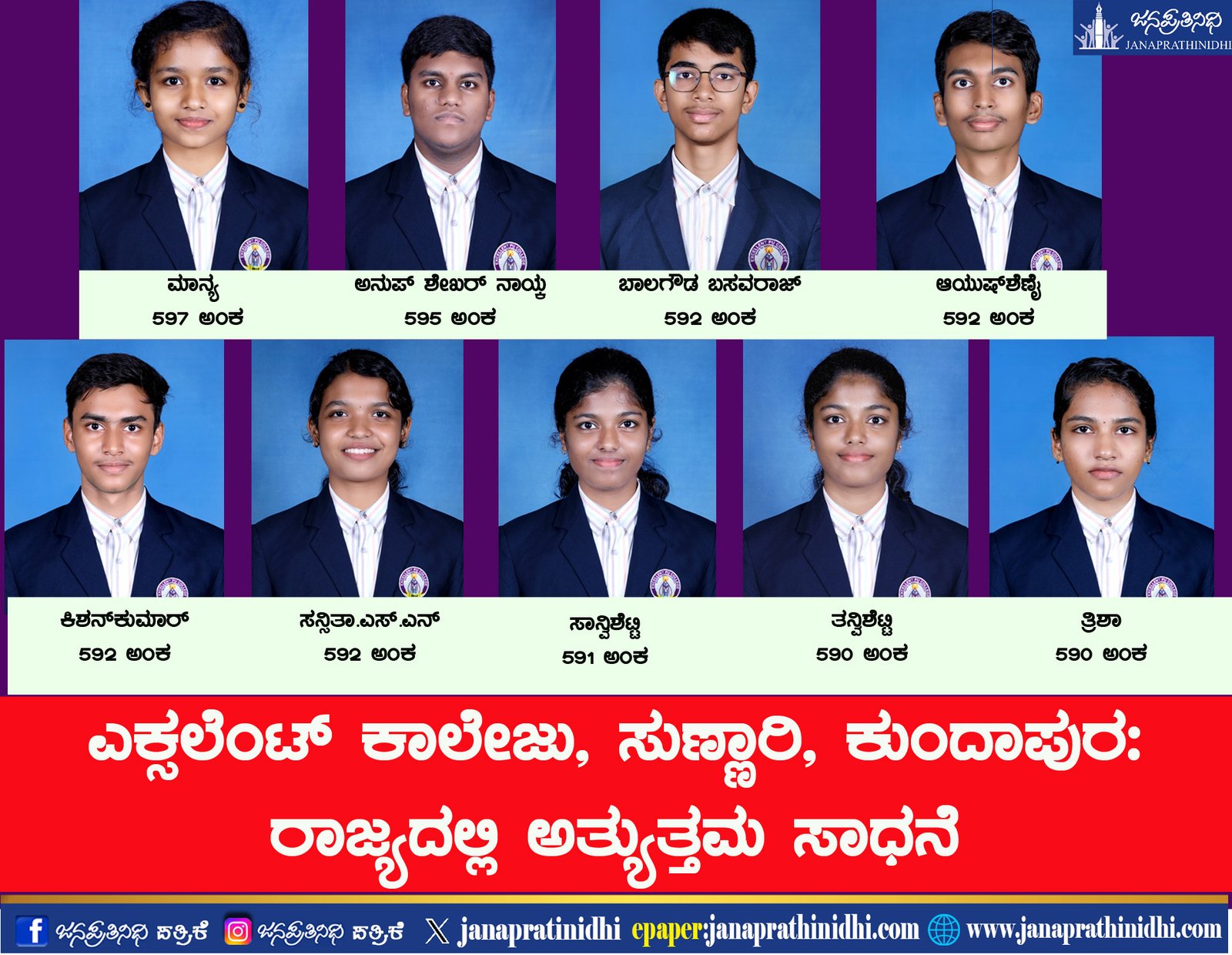 ಕುಂದಾಪುರ: 2025-26ನೇ ಸಾಲಿನ ಶೈಕ್ಷಣಿಕ ವರ್ಷದ ದ್ವಿತೀಯ ಪಿ.ಯು.ಸಿ ವಾರ್ಷಿಕ ಪರೀಕ್ಷೆಯ ಫಲಿತಾಂಶ ಪ್ರಕಟಗೊಂಡಿದ್ದು, ಕುಂದಾಪುರದ ಎಕ್ಸಲೆಂಟ್ ಪದವಿ ಪೂರ್ವ ಕಾಲೇಜಿನ ವಿಜ್ಞಾನ ವಿಭಾಗದ ಕುಮಾರಿ ಮಾನ್ಯ 600ಕ್ಕೆ 597, ಅನುಪ್ ಶೇಖರ್ ನಾಯ್ಕ 600ಕ್ಕೆ 595 ಅಂಕಗಳೊಂದಿಗೆ ರಾಜ್ಯದಲ್ಲಿಯೇ ಅತ್ಯುತ್ತಮ ರ್ಯಾಂಕ್‍ನ್ನು ಗಳಿಸಿ ಎಕ್ಸಲೆಂಟ್ ಇತಿಹಾಸದಲ್ಲಿ ಹೊಸ ದಾಖಲೆಯನ್ನು ನಿರ್ಮಿಸಿದ್ದಾರೆ.
