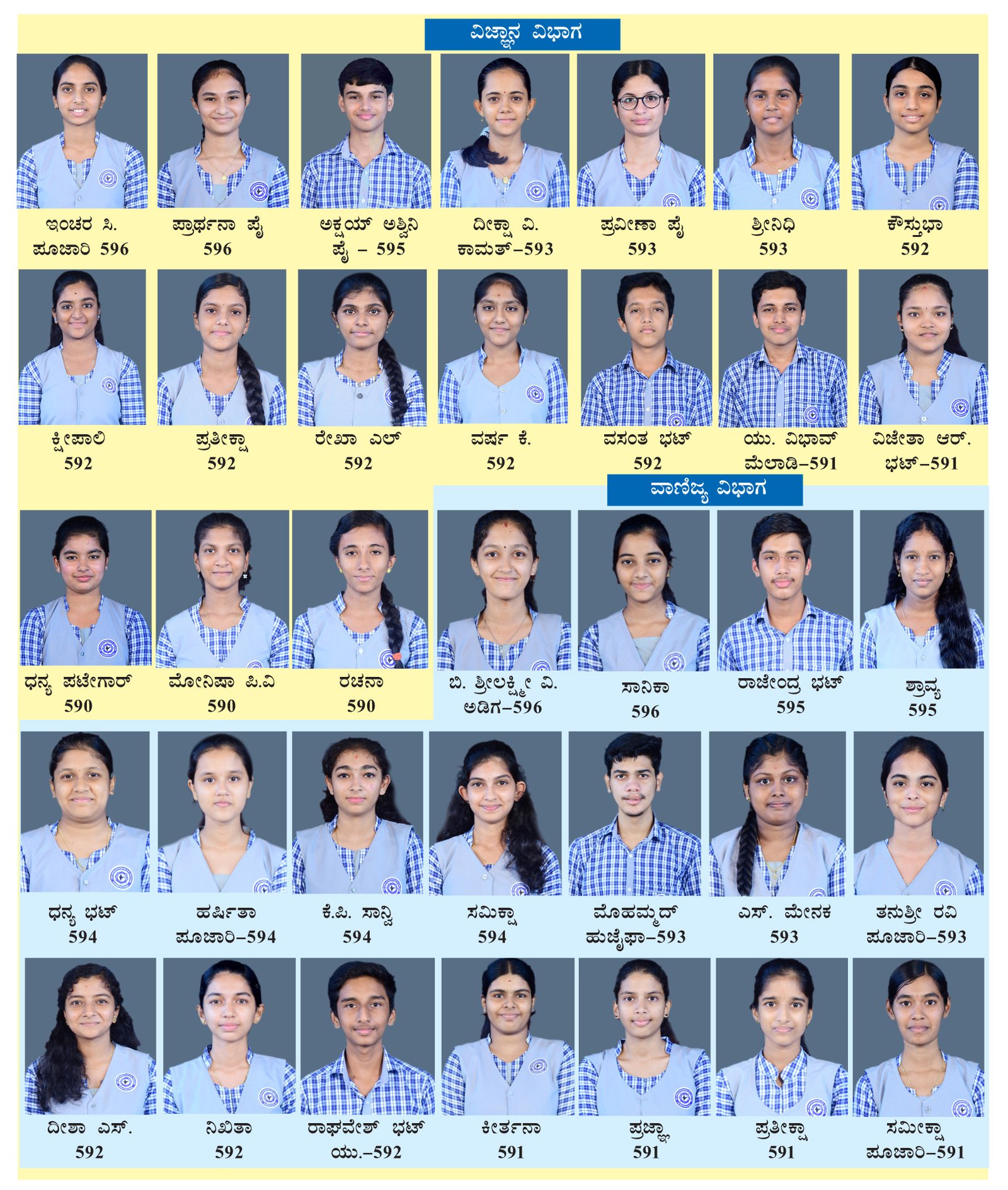 ವಿಜ್ಞಾನ ವಿಭಾಗದಲ್ಲಿ ವಿದ್ಯಾರ್ಥಿನಿ ಪ್ರಾರ್ಥನಾ ಪೈ, ಇಂಚರಾ. ಸಿ. ಪೂಜಾರಿ (596 ) 4 ನೇ Rank , ಅಕ್ಷಯ್ ಅಶ್ವಿನ್ ಪೈ(595) 5 ನೇ Rank, ಪ್ರವೀಣಾ ಪೈ, ದೀಕ್ಷಾ. ವಿ.ಕಾಮತ್, ಶ್ರೀನಿಧಿ (593) 7ನೇ Rank ,ಕೌಸ್ತುಬಾ, ವಸಂತ್ ಭಟ್, ವರ್ಷ. ಕೆ, ಪ್ರತಿಕ್ಷಿತಾ, ರೇಖಾ ಎಲ್, ಕ್ಷಿಪಾಲಿ ( 592) 8 ನೇ Rank,  ವಿಭವ್ ಮೇಲಾಡಿ, ವಿಜೇತಾ ಆರ್. ಭಟ್(591) 9ನೇ Rank, ಧನ್ಯಾ .ಜೆ ಪಟಗಾರ್ , ಮೋನಿಶಾ ಪಿ. ವಿ, ರಚನಾ ( 590) 10 ನೇ Rank ಪಡೆದಿರುತ್ತಾರೆ.