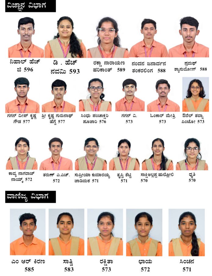 ವಿಜ್ಞಾನ ವಿಭಾಗದಲ್ಲಿ  ನಿಹಲ್ ಹೆಚ್ ಜಿ – 596, ಡಿ . ಹೆಚ್ ನವಮಿ -593 ರಕ್ಷಾ ನಾರಾಯಣ ಹರಿಕಾಂತ್ – 589, ನಂದನ ಜನಾರ್ದನ ಶಂಕರಲಿಂಗ – 588, ಪ್ರಮಥ್ ಶ್ಯಾನುಬೋಗ್ – 588 ಹಾಗೂ ವಾಣಿಜ್ಯ ವಿಭಾಗ:  ಎಂ ಆರ್ ಕಿರಣ – 585, ಸಾತ್ವಿ – 583, ರಕ್ಷಿತಾ – 573 ಉತ್ತಮ ಅಂಕ ಪಡೆದಿರುತ್ತಾರೆ. ಇವರಿಗೆ ಆಡಳಿತ ಮಂಡಳಿ ಅಧ್ಯಕ್ಷರು ಮತ್ತು ನಿರ್ದೇಶಕರು, ಪ್ರಾಂಶುಪಾಲರು ಮತ್ತು ಉಪನ್ಯಾಸಕ ವೃಂದ , ಸಿಬ್ಬಂದಿ ವರ್ಗದವರು ಅಭಿನಂದನೆ ಹಾಗೂ ಶುಭಾಶಯ ಸಲ್ಲಿಸಿರುತ್ತಾರೆ.