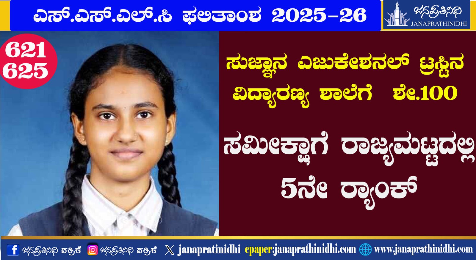 ಸುಜ್ಞಾನ ಎಜುಕೇಶನಲ್ ಟ್ರಸ್ಟ್ ವಿದ್ಯಾರಣ್ಯ ಶಾಲೆ; ನೂರಕ್ಕೆ ನೂರು ಫಲಿತಾಂಶ: ಸಮೀಕ್ಷಾ ರಾಜ್ಯಕ್ಕೆ 5ನೇ RANK