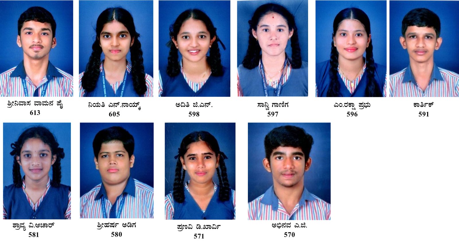 ಶ್ರೀನಿವಾಸ ವಾಮನ ಪೈ 613, ನಿಯತಿ ಎನ್.ನಾಯ್ಕ್ 605, ಅದಿತಿ ಜಿ.ಎನ್. 598, ಸಾನ್ವಿ ಗಾಣಿಗ 597, ಎಂ.ರಕ್ಷಾ ಪ್ರಭು 596, ಕಾರ್ತಿಕ್ 591, ಶ್ರಾವ್ಯ ವಿ.ಆಚಾರ್ 581, ಶ್ರೀಹರ್ಷ ಅಡಿಗ 580, ಪ್ರಣವಿ ಡಿ.ಖಾರ್ವಿ 571, ಅಭಿನವ ಎ.ಜಿ. 570 ಉತ್ತಮ ಸಾಧನೆ ಮಾಡಿದ್ದಾರೆ.
