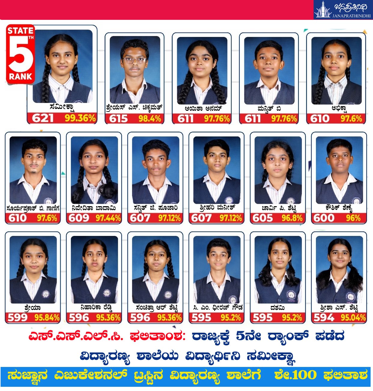 ಶ್ರೇಯಸ್ ಎಸ್ ಚಿಕ್ಕಮಠ (615) ಆಯಿಷ ಆನಾಮ್ (611) ಮನ್ವಿತ್ ಬಿ (611) ಅಭಿಕ್ಷಾ(610) ಸೂರ್ಯಪ್ರಕಾಶ್ ಬಿ.ಗಾಣಿಗ (610) ನಿವೇದಿತಾ ಚಂದ್ರ ಮೌಳೇಶ್ವರ ಬಾದಾಮಿ (609) ಶ್ರೀಹರಿ ಮನೀಷ್ (607) ಸನ್ವಿತ್ ಜಿ ಪೂಜಾರಿ (607) ಚಾರ್ವಿ ಪಿ ಶೆಟ್ಟಿ (605) ಕೌಶಿಕ್ ಶೆಣೈ (600) ಶ್ರೇಯಾ (599) ನಿಹಾರಿಕಾ ರೆಡ್ಡಿ(596) ಸಂಚಿತಾ ಆರ್ ಶೆಟ್ಟಿ (596) ಸಿ.ಎಂ. ಧೀರಜ್ ಗೌಡ (595) ದಶಮಿ (595) ಶ್ರೀಶಾ ಎಸ್ ಶೆಟ್ಟಿ (594)ಪ್ರಜ್ವಲ್ ಎಸ್ .ಕುಲಾಲ್ (593) ಬ್ರಾಹ್ಮಿ ಆರ್ ಶೆಟ್ಟಿ (592) ಸಾಯಿನಿಧಿ ಸಿ ಶೆಟ್ಟಿ (592) ಅನುಜ್ ಈಶ್ವರ್ ಅಂಬಲಿ(591) ಬಿ.ಎ ಶಾಹಿಲ್ (588) ಎಚ್.ವಿಜಯಾ ಪೈ(588) ಪ್ರತೀಕ್ಷಾ ಮಡಿವಾಳ (588) ಪ್ರಕೃತಿ ಶೆಟ್ಟಿ (586)ಪೃಥ್ವಿ ರಮೇಶ್ ಶಿರೆಣ್ಣವರ್ (586) ಪ್ರಥಮ ಆಚಾರ್ (585) ಪ್ರೀತಮ್ ಕುಲಾಲ್(585) ವೈಷ್ಣವಿ ಮಾಧವ ಪ್ರಭು(584) ನವ್ಯಶ್ರೀ (583) ಸಂಪತ್ ಶೆಟ್ಟಿ (580). ಪರೀಕ್ಷೆ ಬರೆದ 129 ವಿದ್ಯಾರ್ಥಿಗಳಲ್ಲಿ 11 ವಿದ್ಯಾರ್ಥಿಗಳು 600ಕ್ಕೂ ಅಧಿಕ ಅಂಕ, 17 ವಿದ್ಯಾರ್ಥಿಗಳು 95%ಕ್ಕಿಂತ ಅಧಿಕ ಅಂಕ ಪಡೆದರೆ ,67 ವಿದ್ಯಾರ್ಥಿಗಳು ಡಿಸ್ಟಿಂಕ್ಷನ್ ಅಂಕ ಪಡೆದಿದ್ದಾರೆ.