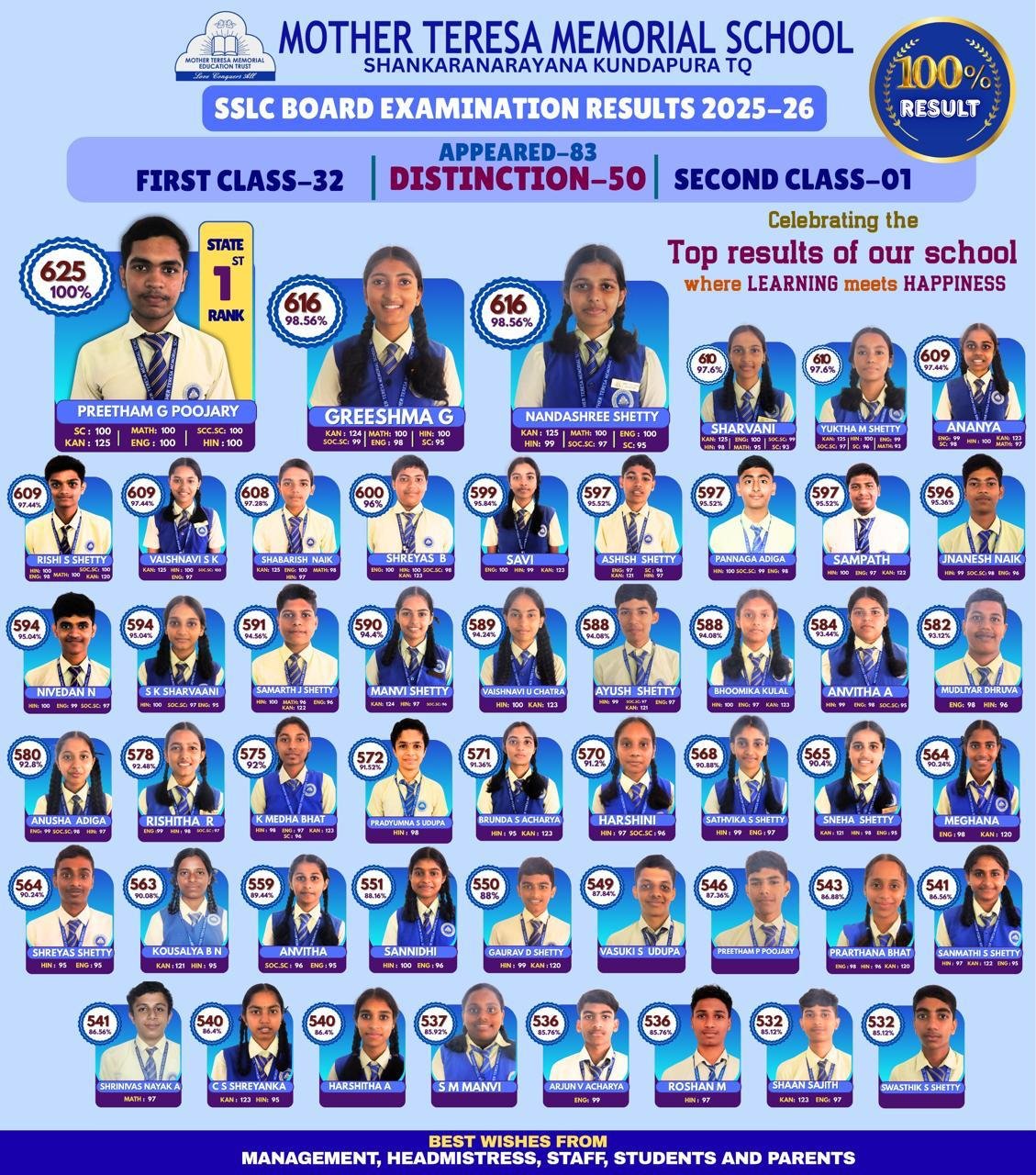 ಮದರ್ ತೆರೆಸಾ ಮೆಮೋರಿಯಲ್  ಸ್ಕೂಲ್ ರಾಜ್ಯಕ್ಕೆ ಪ್ರಥಮ Rank : 50  ವಿಶಿಷ್ಟ ಶ್ರೇಣಿ, 32  ಪ್ರಥಮ  ಶ್ರೇಣಿಯೊಂದಿಗೆ 100% ಫಲಿತಾಂಶ