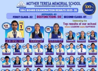 625ಕ್ಕೆ 625 ಅಂಕಗಳೊಂದಿಗೆ ರಾಜ್ಯಕ್ಕೆ ಪ್ರಥಮ Rankನೊಂದಿಗೆ ಎಸ್‌ಎಸ್‌ಎಲ್‌ಸಿ ಪರೀಕ್ಷೆಯಲ್ಲಿ ಅದ್ಭುತ ಸಾಧನೆ ಶಂಕರನಾರಾಯಣ: ಮದರ್ ತೆರೇಸಾ ಮೆಮೋರಿಯಲ್ ಸ್ಕೂಲ್‌ನ 83 ವಿದ್ಯಾರ್ಥಿಗಳು ಈ ವರ್ಷದ ಎಸ್‌ಎಸ್‌ಎಲ್‌ಸಿ ಪರೀಕ್ಷೆಗೆ ಹಾಜರಾಗಿ ಎಲ್ಲರೂ ಯಶಸ್ವಿಯಾಗಿ ಉತ್ತೀರ್ಣರಾಗಿದ್ದಾರೆ....